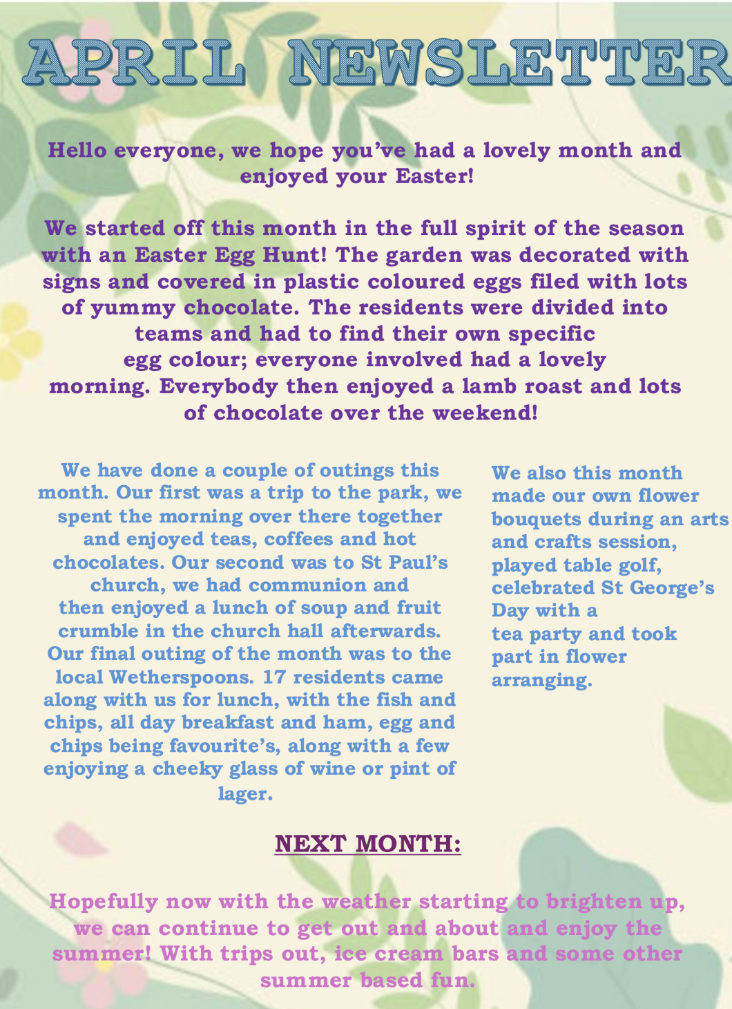 Hello everyone, we hope you have had a lovely Easter and enjoyed the month of April. This is a newsletter covering all of the goings on here at Somerforde Care Home. We would love to know what you got up to as well, so please get in touch if you have anything to share about your visit to Somerforde here in sunny Devon.